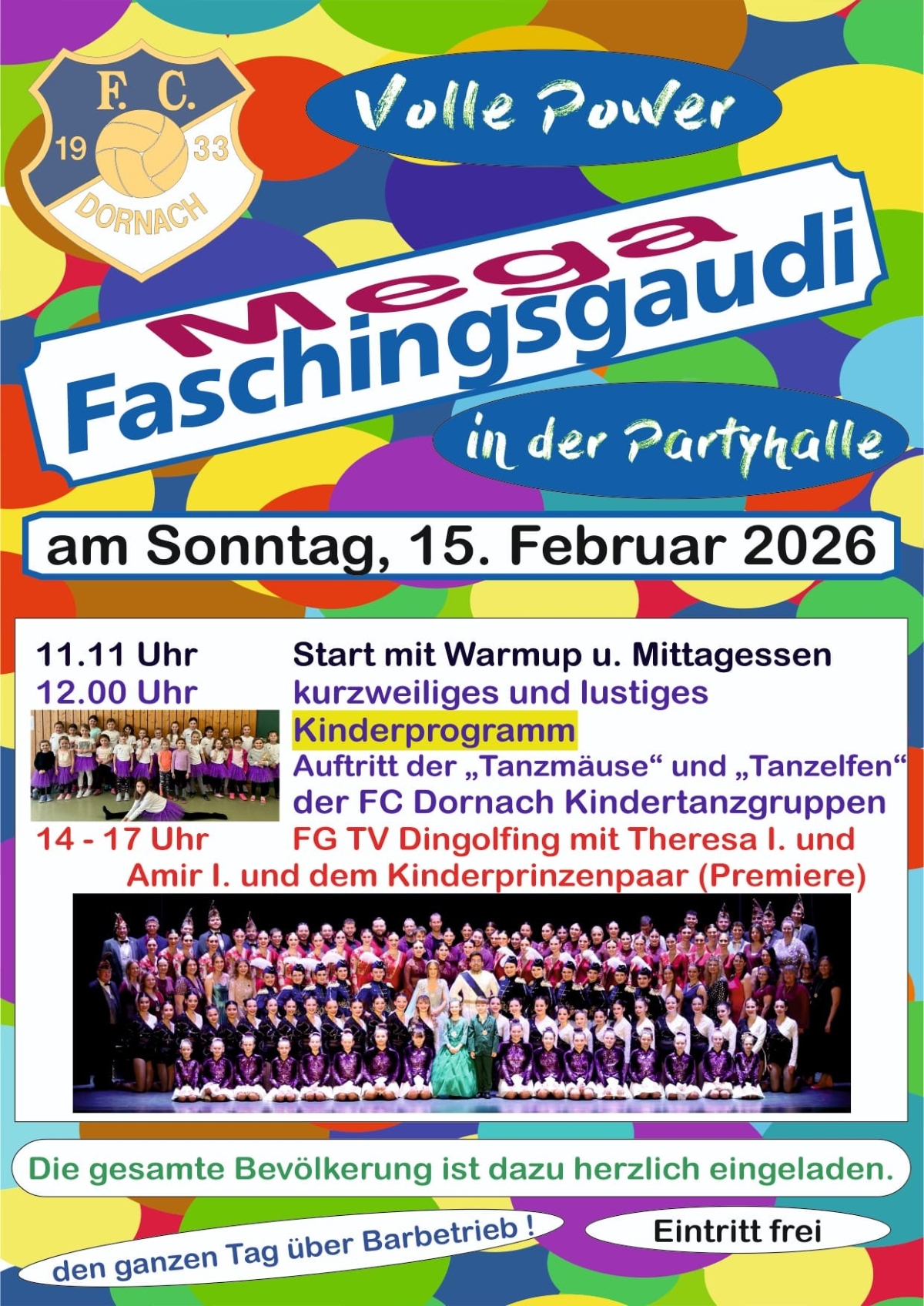 Der FC Dornach lädt am Faschingssonntag, 15. Februar, wieder die gesamte Bevölkerung aus nah und fern zur großen Faschingsgaudi nach Dornach in die Mega-Event-Halle der FC Stockschützen ein. Beginn ist traditionell um 11.11 Uhr mit Warm-up und Mittagessen. Für Speis und Trank ist ganztägig gesorgt.