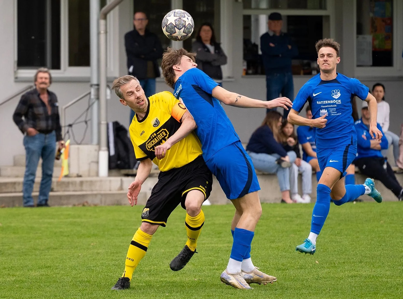 Foto von v. links: In blauen Trikots Valentin Aigner und Stefan Knogl, der Schütze zum 1:0, beschäftigten die Abwehr der Spvgg Haberskirchen mit Kapitän Thomas Peissl in gelbem Dress.