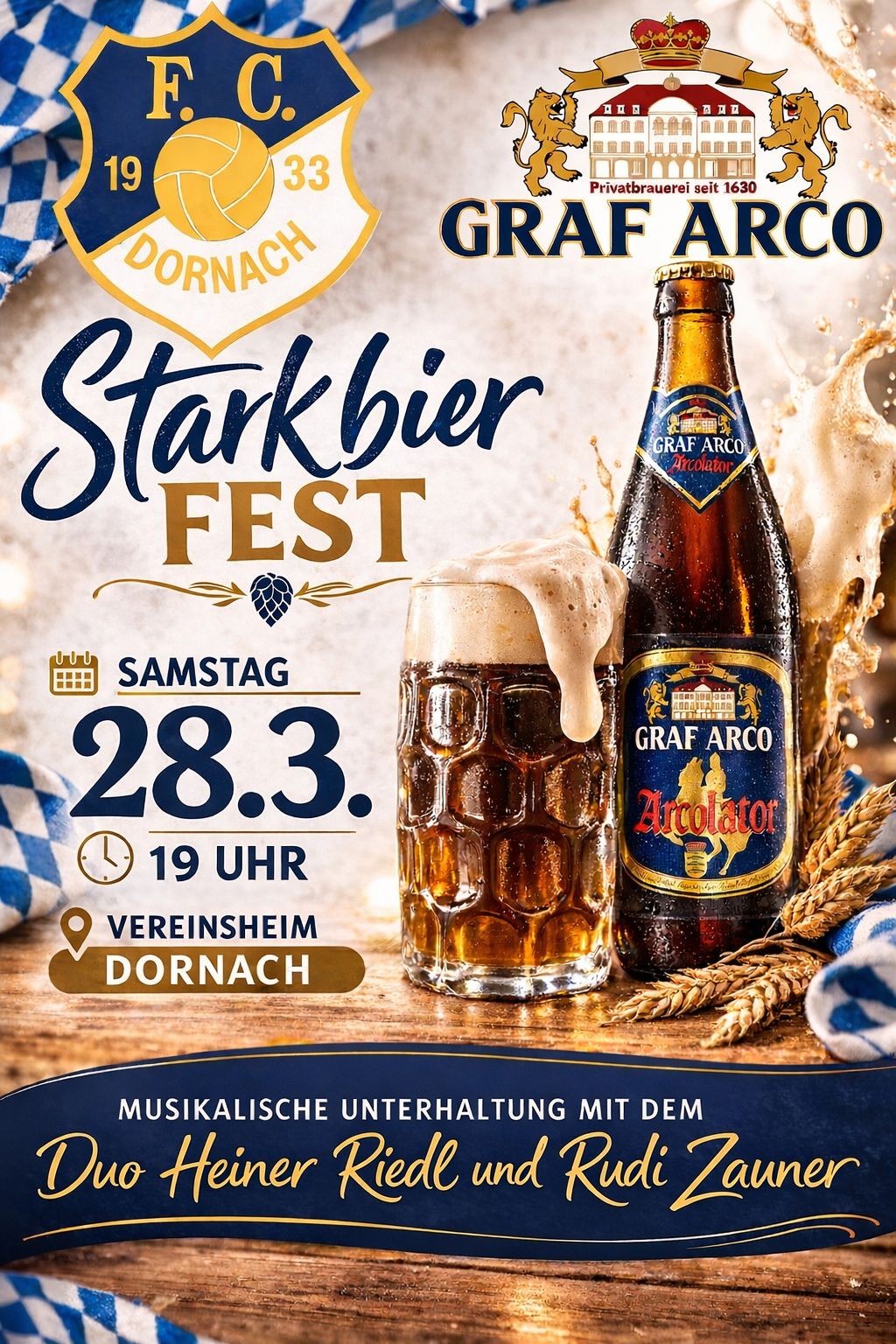 Der FC Dornach lädt am Samstag, den 28.03.2026, ab 19 Uhr zum Starkbierfest ein. Nach dem Spiel der Mannschaften in Julbach findet in der Sportgaststätte das traditionelle Fastenbier statt und die...
