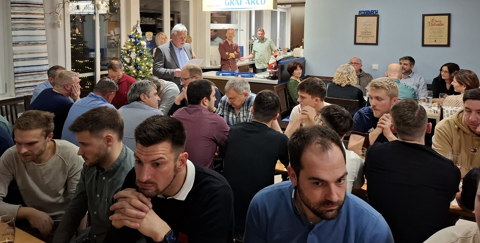 Foto: Vorstand Ed Moosauer begrüßte zum letzten Mal nach 11 Jahren Vorstandschaft die vielen Gäste im voll besetzten FC-Vereinslokal zur Weihnachtsfeier.