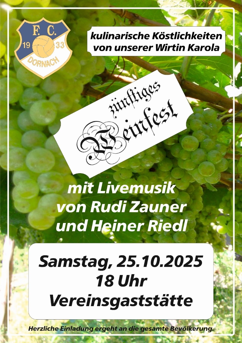 Der FC Dornach lädt am Samstag, den 25. Oktober 2025, herzlich zum Weinfest ins Vereinslokal ein. Ab 18 Uhr können die Gäste in der Vereinsgaststätte zahlreiche Schmankerl und erlesene Weine gemeinsam mit Freunden und Bekannten genießen.